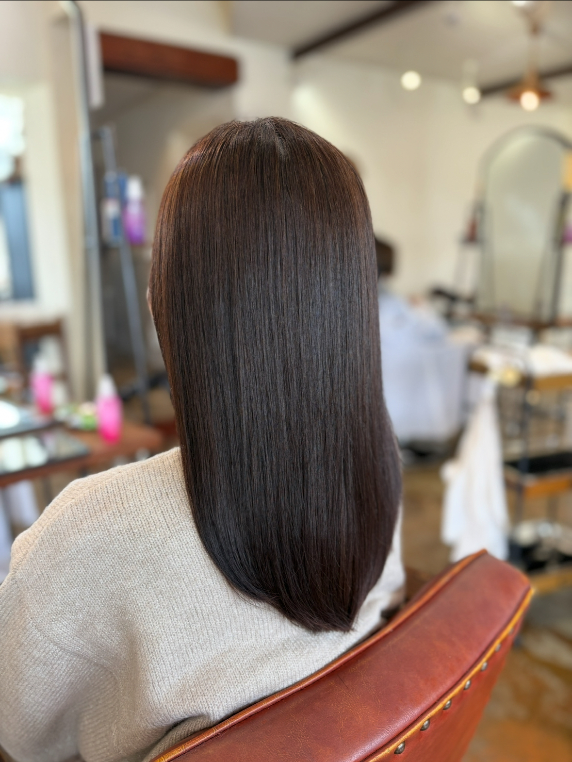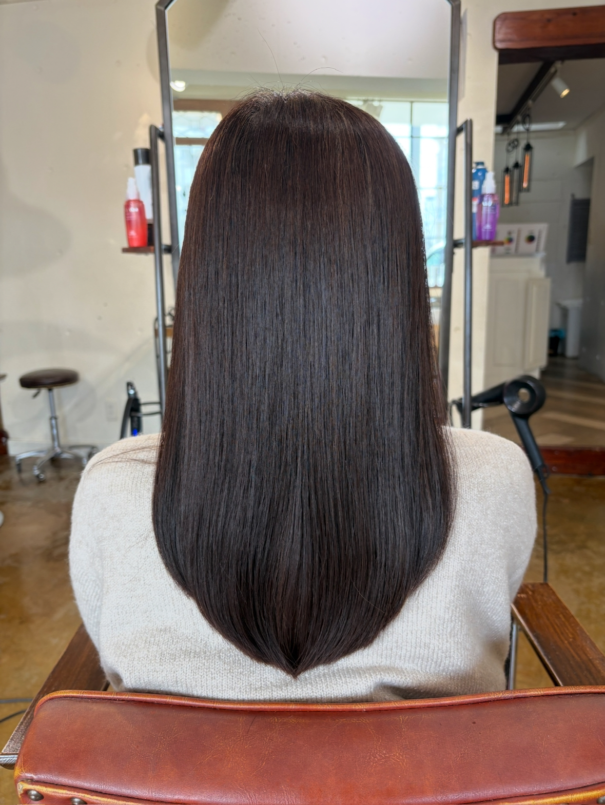 施術後は、髪表面が整うことで光が均一に反射し、自然なツヤが生まれます。また、指通りもなめらかになり、思わず触れたくなるような質感に仕上がります。
