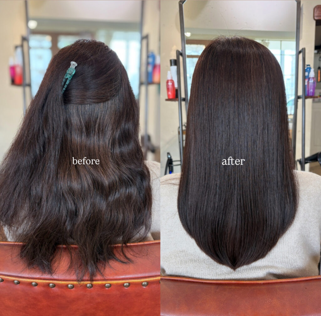 実際の施術では、うねりや広がりが気になる状態から、ツヤのあるまとまりのある髪へと大きく変化します。見た目の美しさだけでなく、手触りや扱いやすさも向上するのが特徴です。