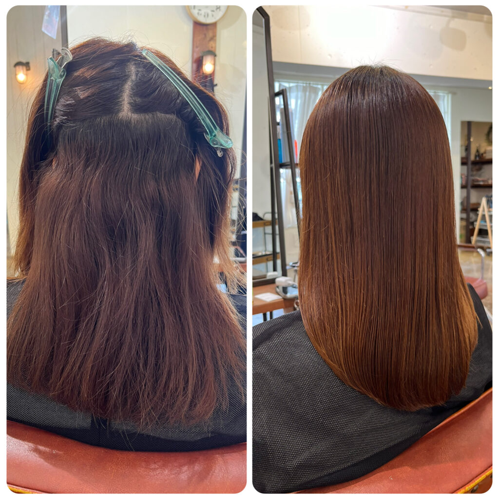 不自然に真っ直ぐになるのではなく、柔らかく自然なストレートになるのが特徴です。そのため、「縮毛矯正をかけた感」が出にくく、ナチュラルな美しさを保つことができます。また、手触りも良くなり、日常的な扱いやすさが格段に向上します。